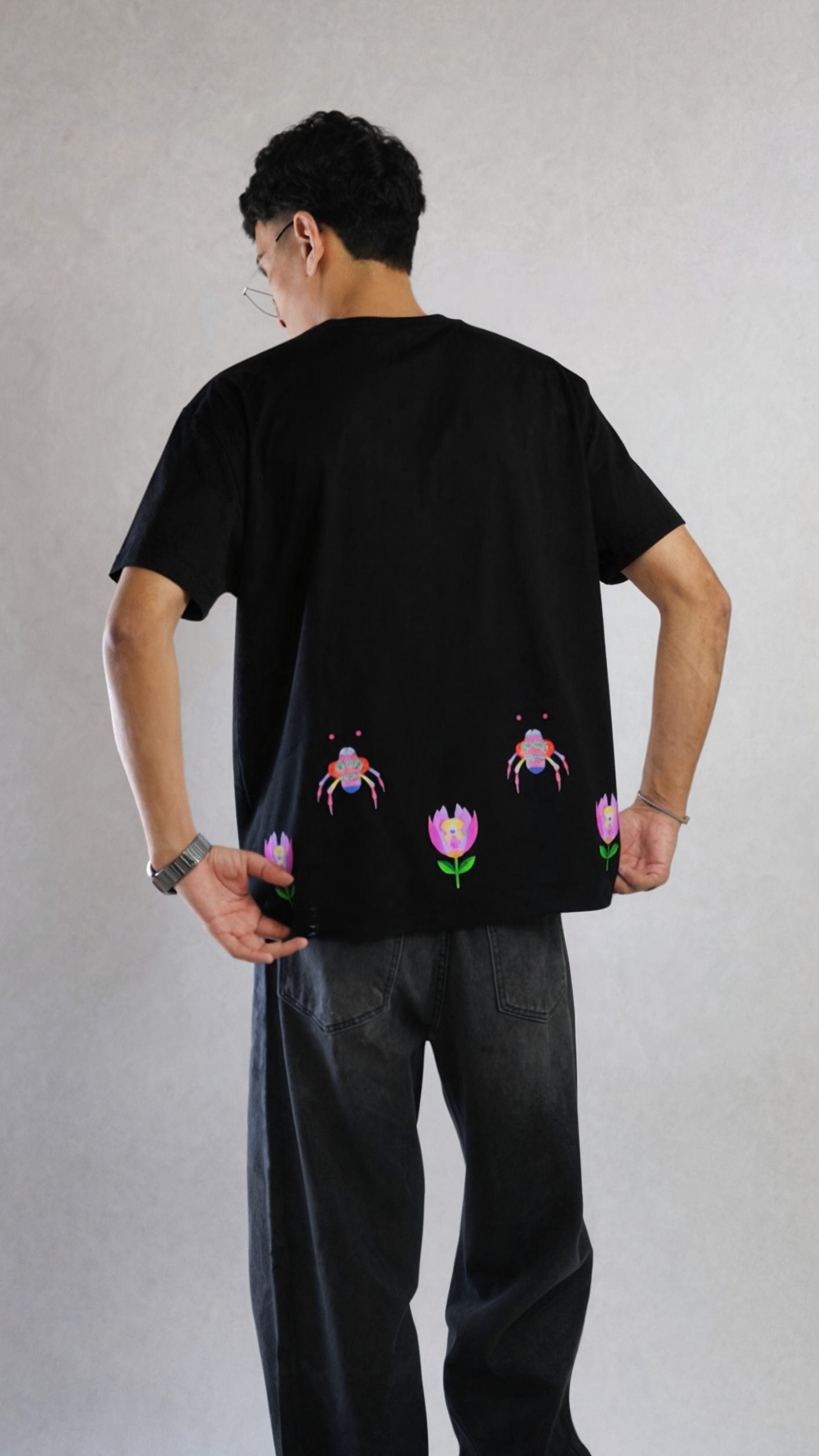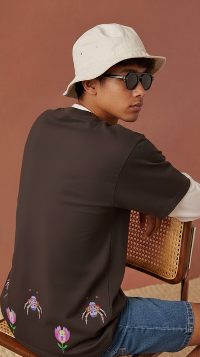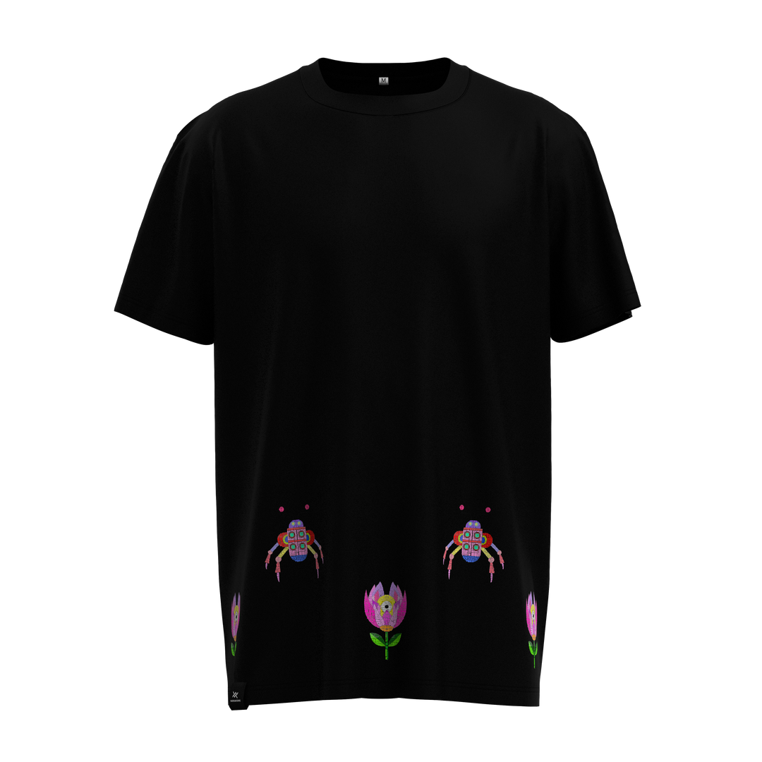 Un’esplosione di vita: fiori e piccoli insetti in un gioco di colori creano un’armonia leggera e gioiosa. La grafica cattura la freschezza e l’energia della primavera, trasformando ogni dettaglio in un’esperienza visiva da indossare. La stampa è realizzata con inchiostri a base d’acqua certificati Oeko-Tex®, per un impatto ambientale ridotto e una scelta più consapevole.